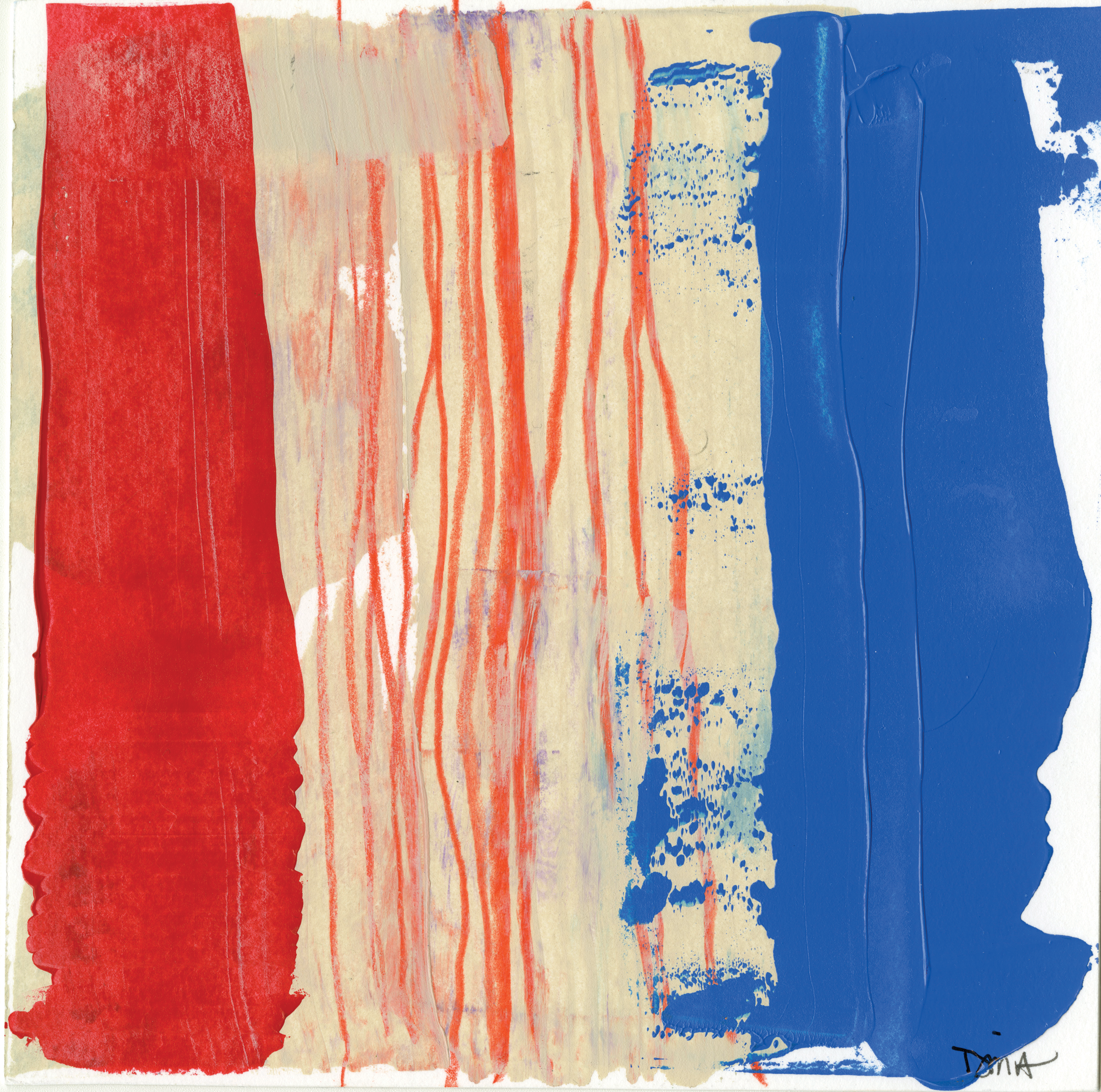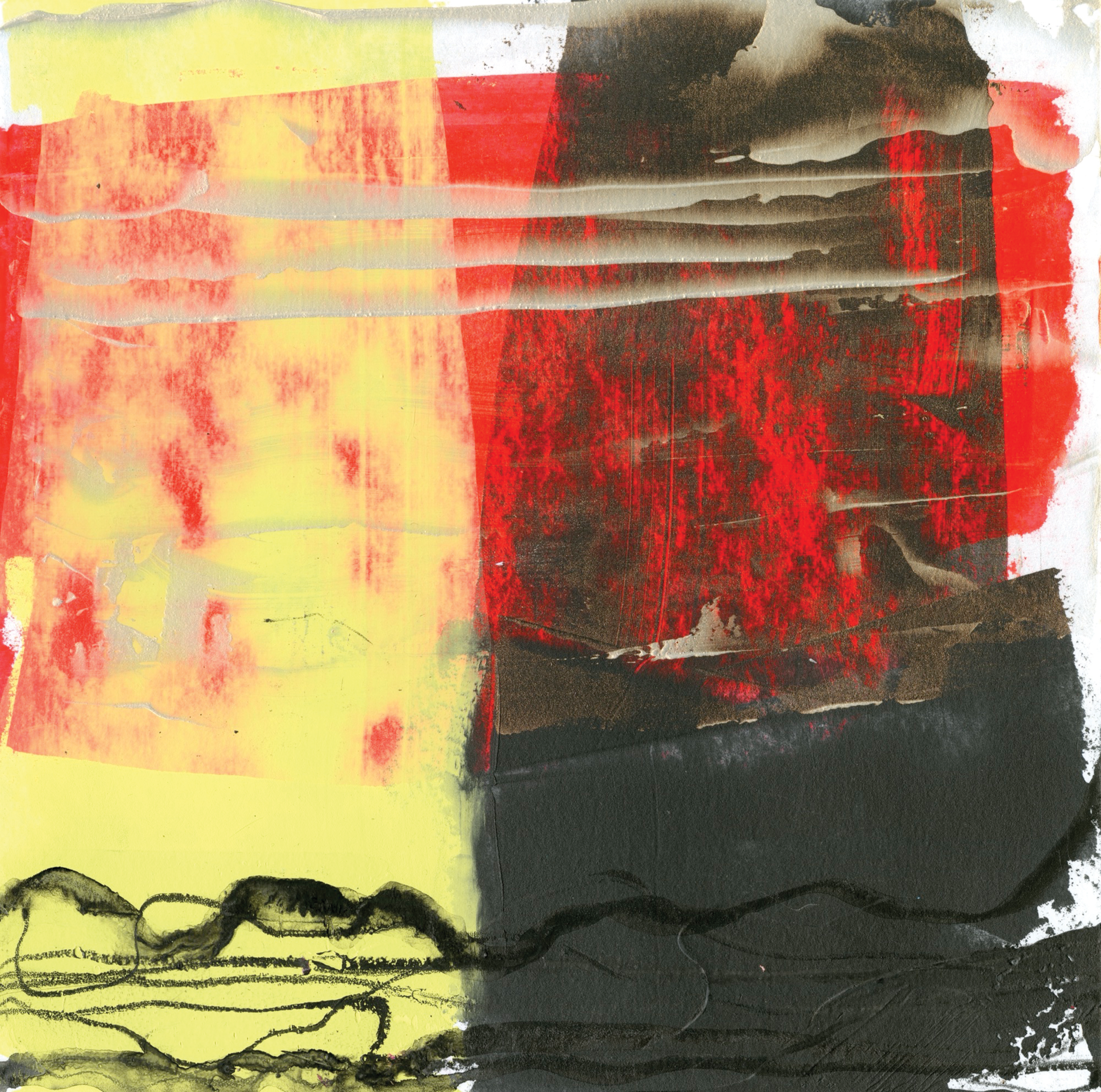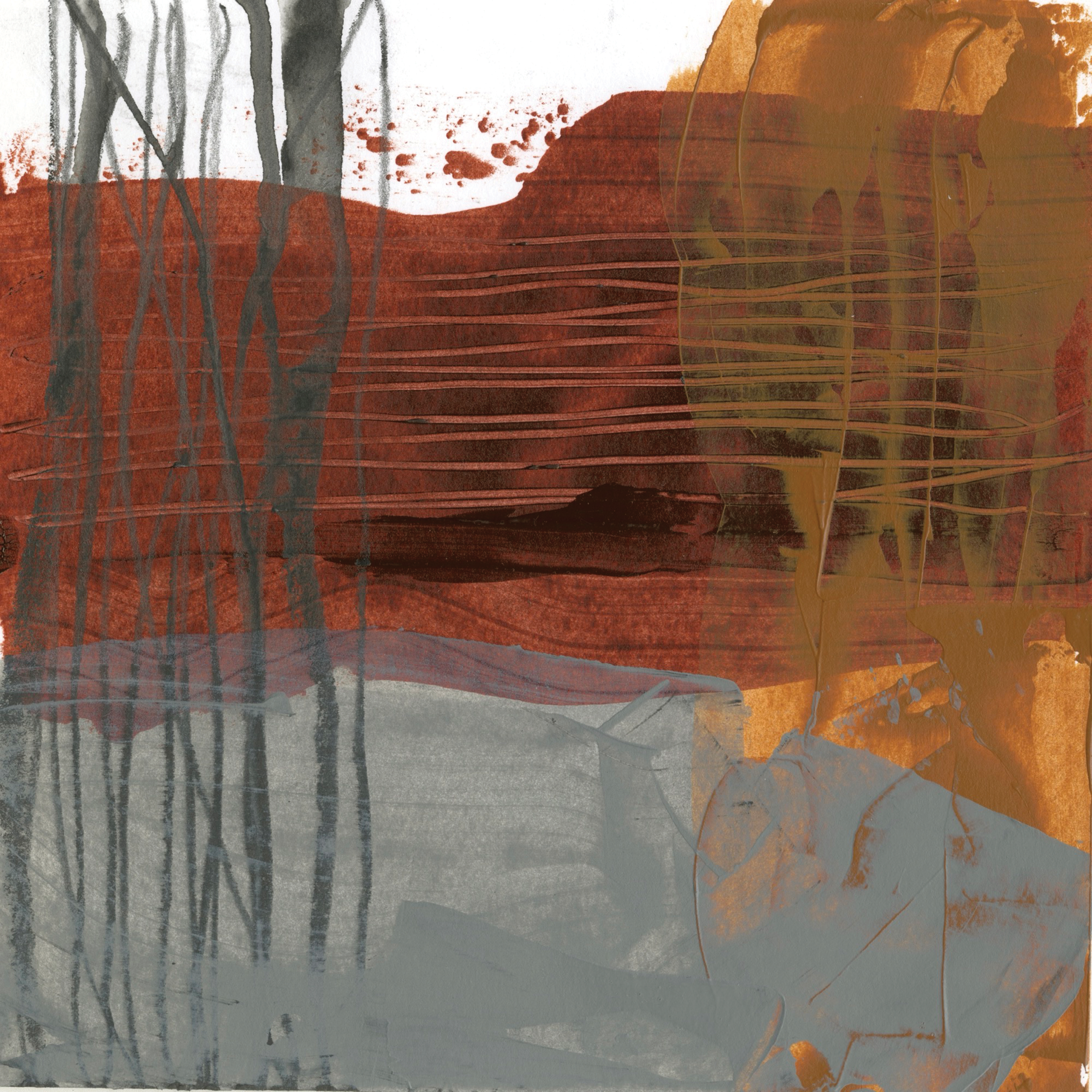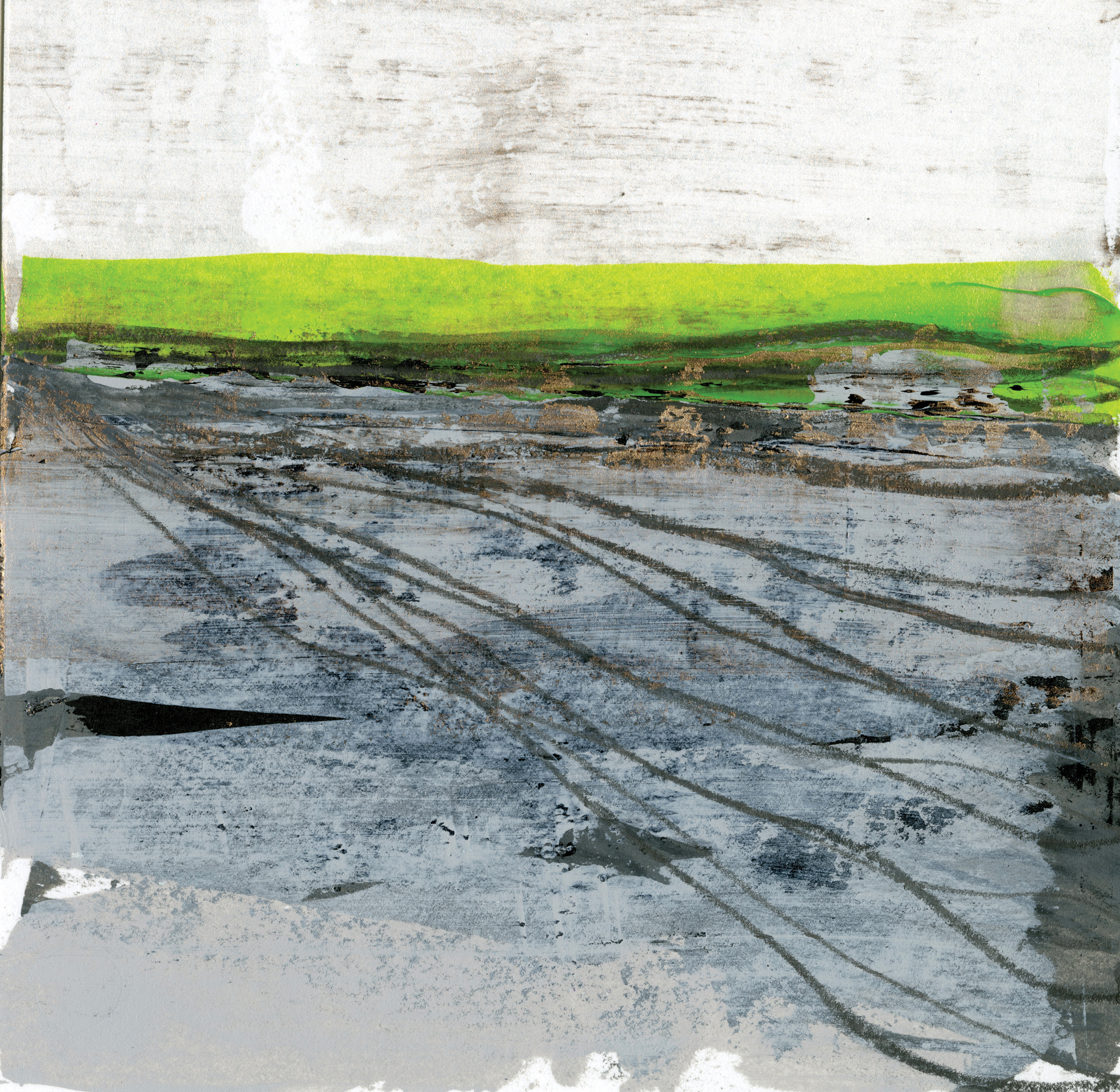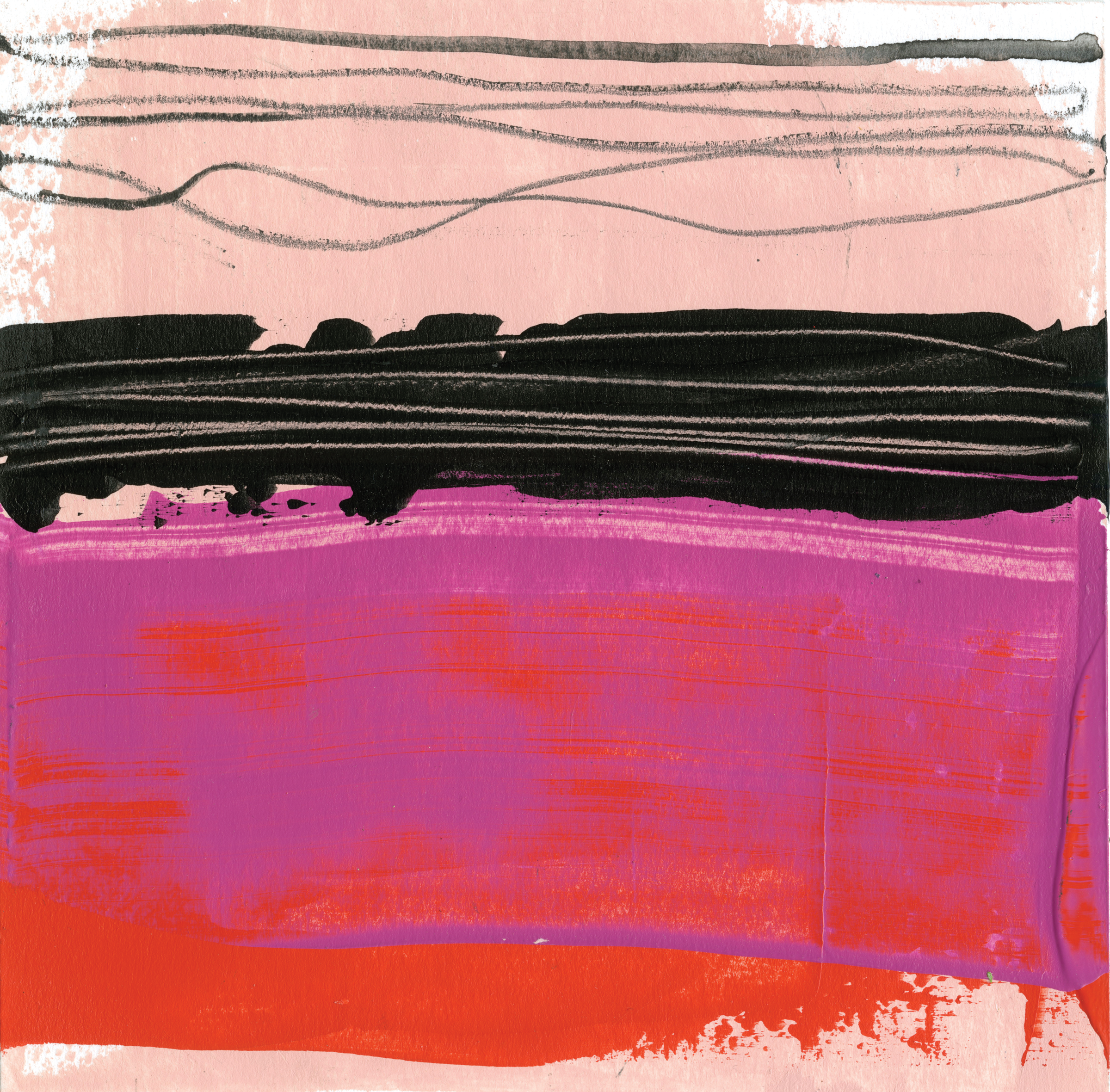My creativity was sparked by COVID, of all things, and what I coined my “Quarantine Creative.” I started taking out all of my art supplies and playing with watercolor landscapes, which I called “colorscapes.” The idea was to let the water move as it wanted against the page to create a loose, abstract visual of what I saw on my daily walks. I was also taking black-and-white photos every day, focusing on line and texture. I like the idea of playing with lines that emulate horizons and layering values that create depth. Working abstractly is new to me, and I have had a lot of fun experimenting with new painting tools and different types of acrylic paints, mediums, and soluble artists’ crayons.